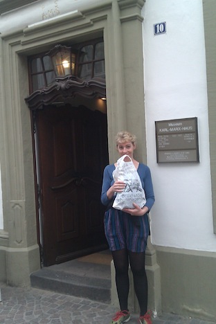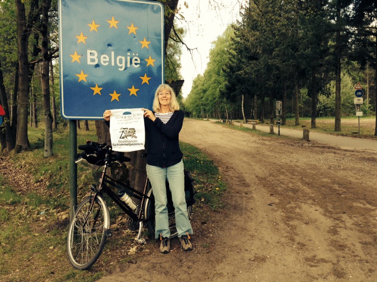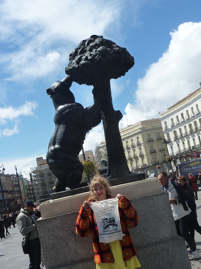 Het is slechts 500 km, gerekend vanaf onze boekwinkel, maar toch! Hier ziet u onze globetrotster Andrea met ons tasje op weg naar de Brandenburger Tur, en rechts voor (een stukje van) het voormalige „IJzeren Gordijn”