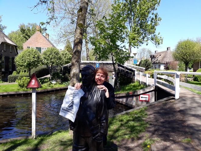 Andrea de Leeuw helemaal in Giethoorn bij het standbeeld van Albert Mol.