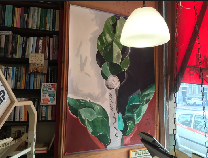Er hang weer een nieuw kunstwerk van Joan Verheyen in de etalage in de reeks schrijversportretten.